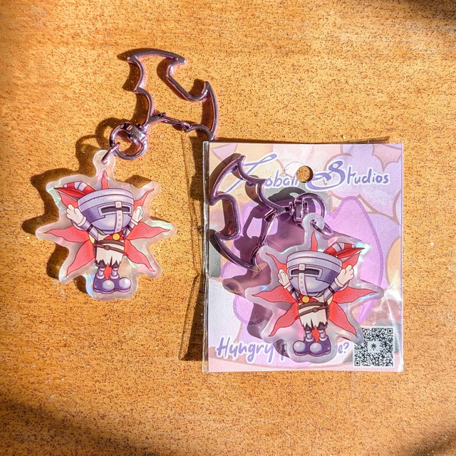 A keychain of Cuphead as Knight Solaire from Dark Souls
