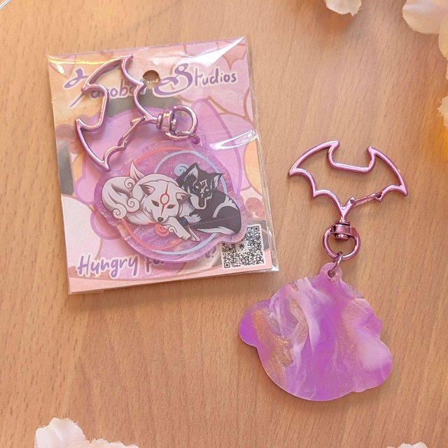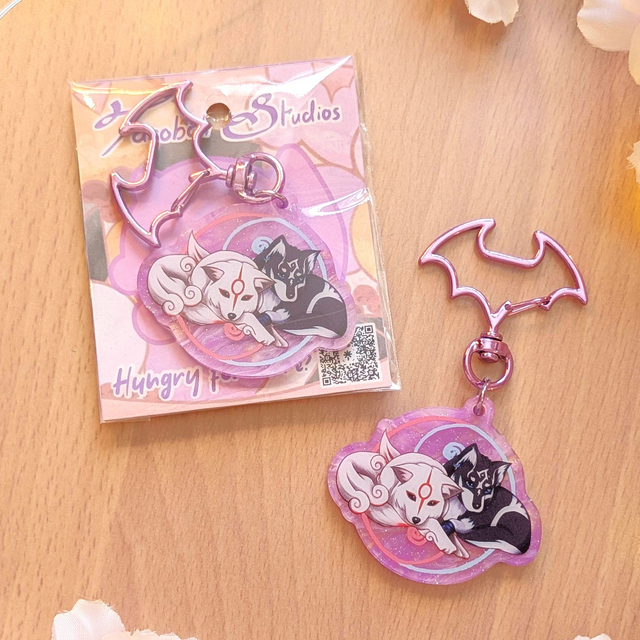 A keychain of Amaterasu from Okami with Link from Twilight Princess.